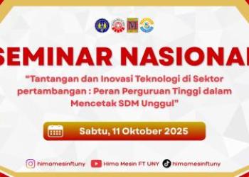 Departemen Pendidikan Teknik Mesin (DPTM) Fakultas Teknik Universitas Negeri Yogyakarta berkolaborasi dengan Himpunan Mahasiswa Mesin (HIMA MESIN) sukses menyelenggarakan Seminar Nasional Teknik Mesin 2025 pada Sabtu, 11 Oktober 2025.